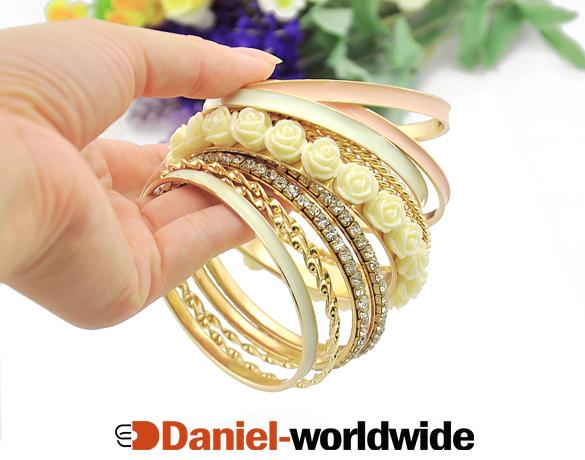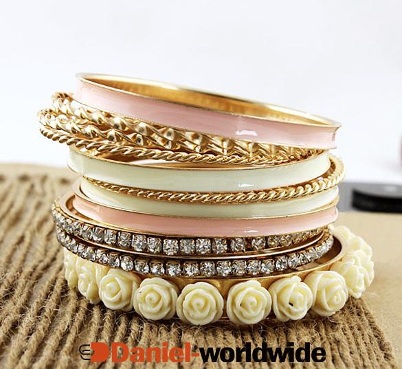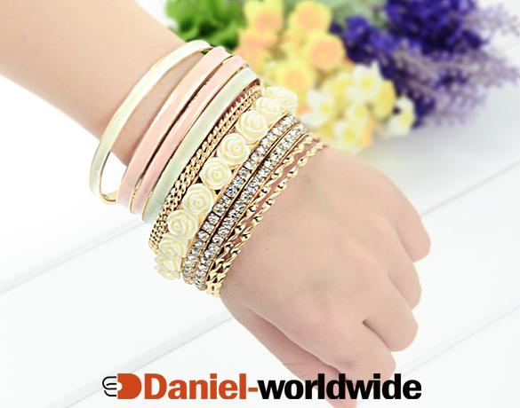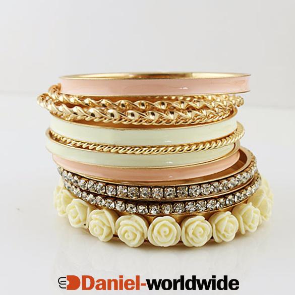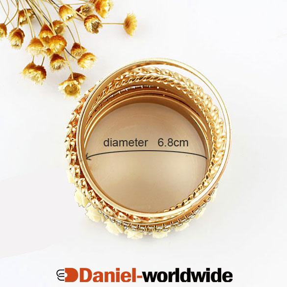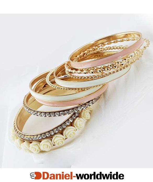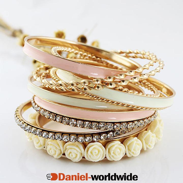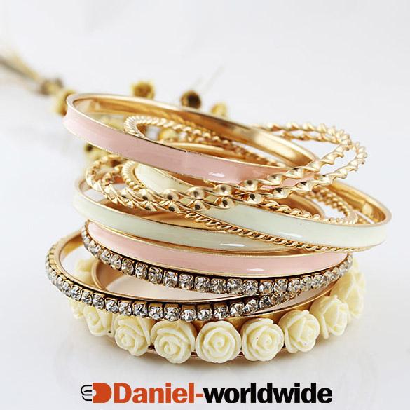 11 Pcs Jewelry Flowers Rhinestone Charm Multilayer Bracelet Golden