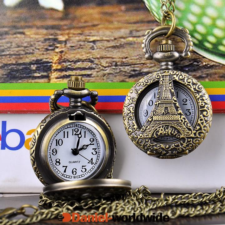 Double-side Eiffel Tower Vintage Style Bronze Steampunk Quartz Necklace Pocket Watch