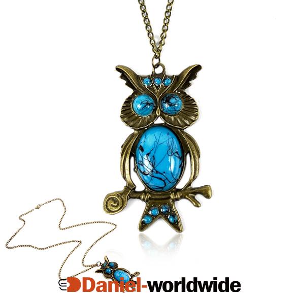 Retro Women's Night Owl Style Blue Stone Sweater Chain Necklace