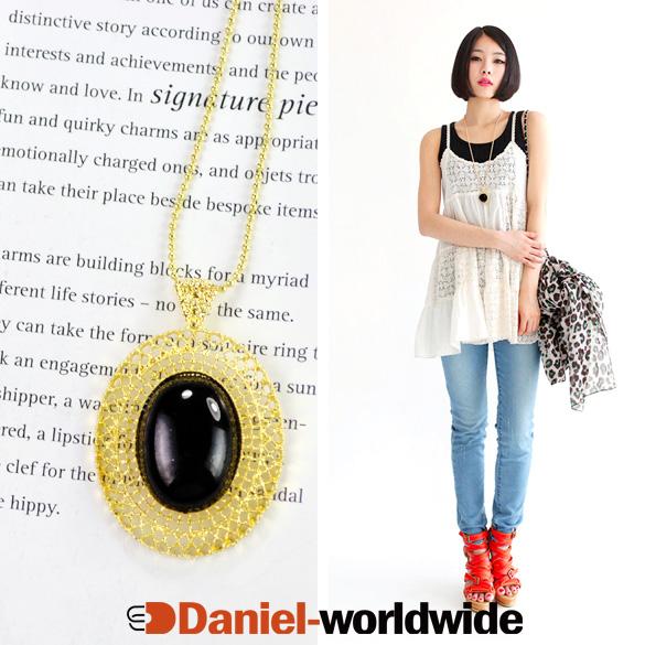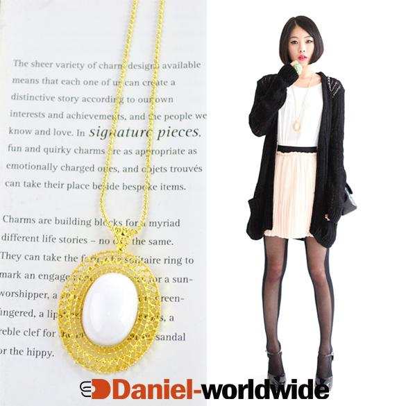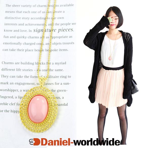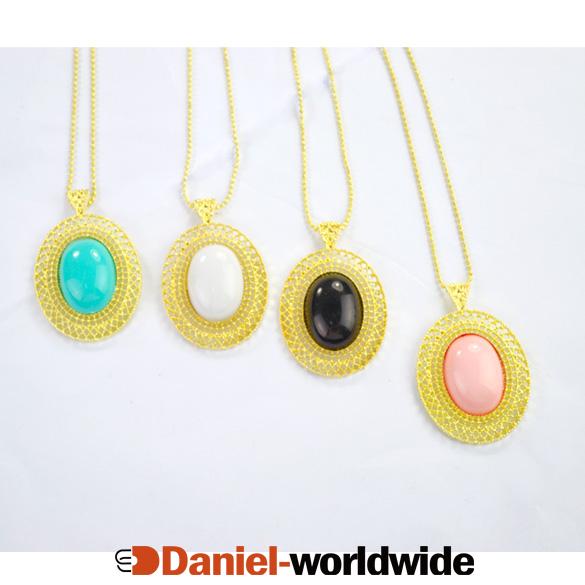 New Fashion Oval Pink Green Black White Gem Gold Plated Chain Necklace