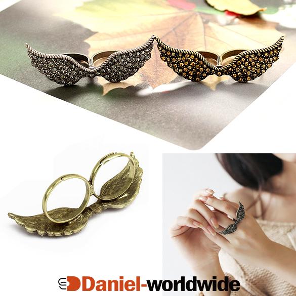 New Fashion Women's Girls Retro Rhinestone Fly Wings Double Two Fingers Adjustable Ring