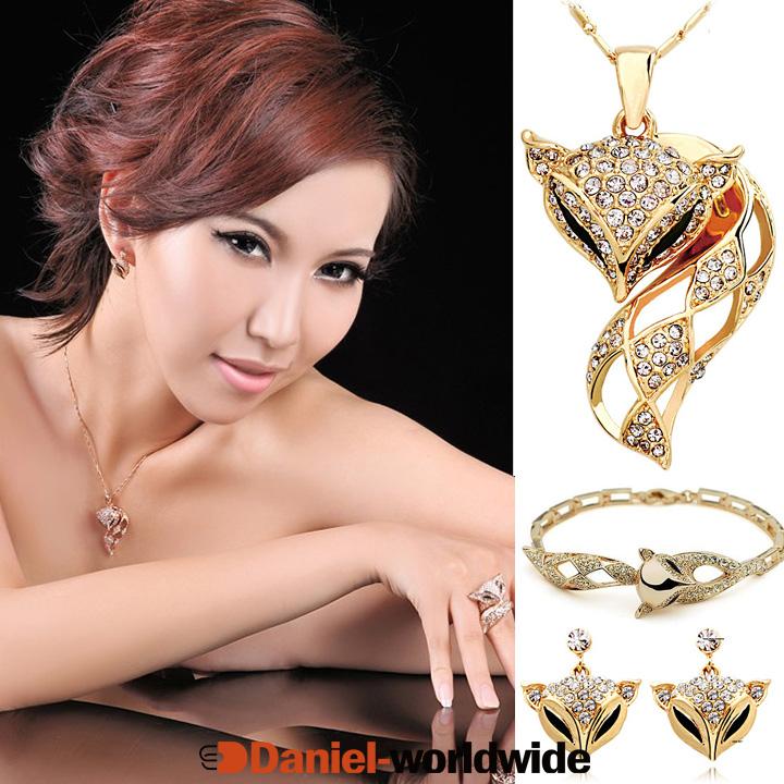 Jewelry Fox Pendant Gold Plated Metal Bangle Necklace And Earrings Set
